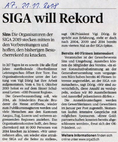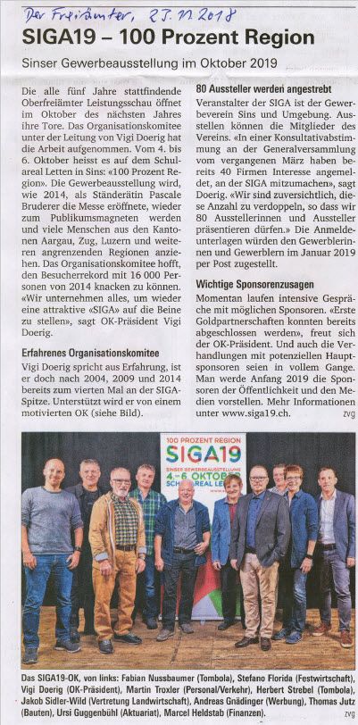 Die fünfte Sinser Gewerbeausstellung, die SIGA19, schloss nach drei erlebnisreichen Tagen die Toren mit einem Besucherrekord. 19'000 Besucher, 3000 mehr als vor fünf Jahren, besuchten die Leistungsschau des Oberfreiämter Gewerbes.
