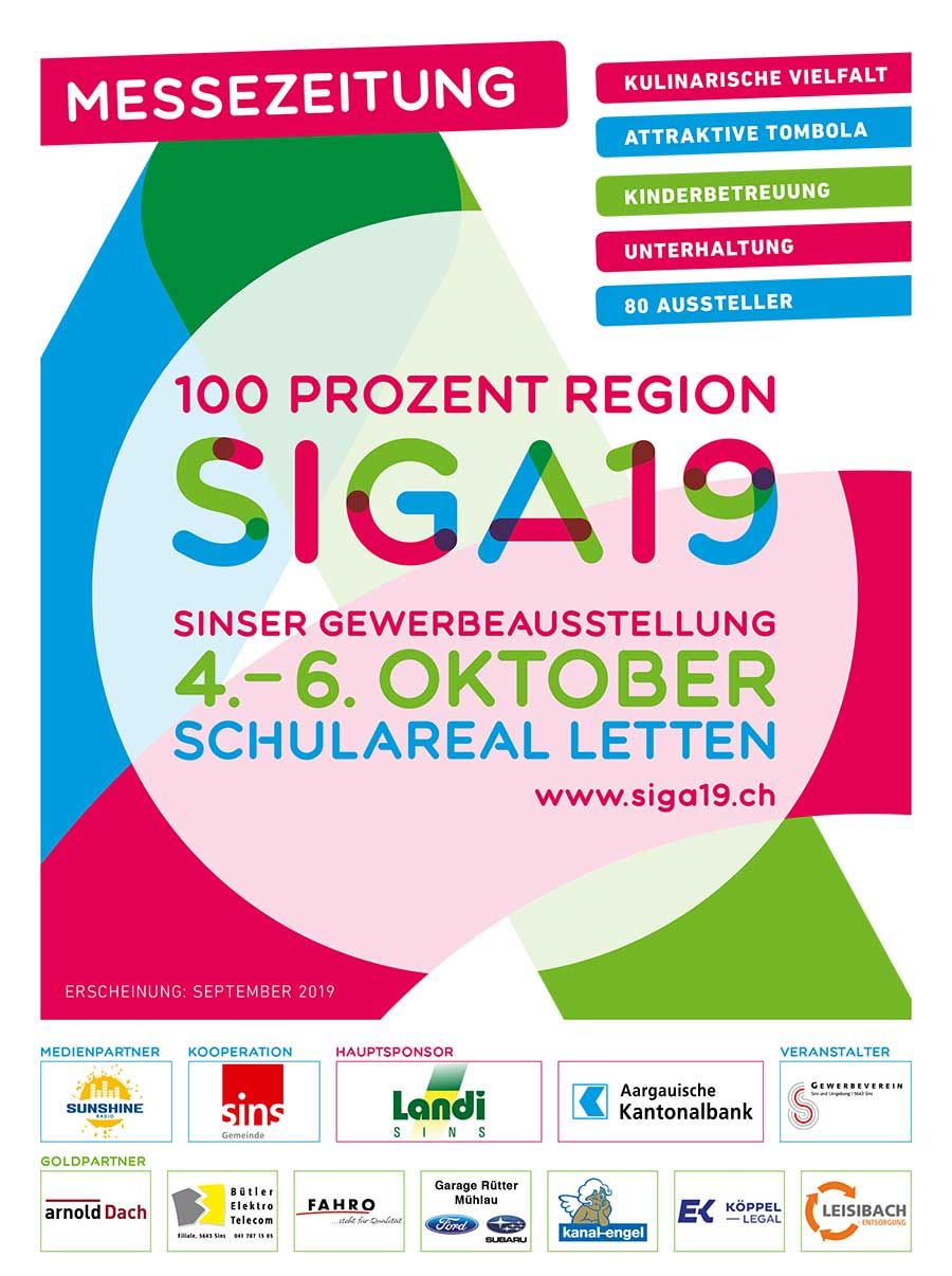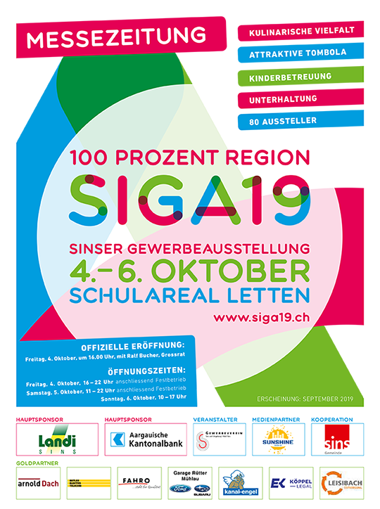 Das Organisationskomitee der alle fünf Jahre stattfindenden Sinser Gewerbeausstellung (SIGA) freut sich, mit der Aargauischen Kantonalbank und der Landi Sins zwei starke Partner als Hauptsponsoren präsentieren zu dürfen. Vom 4. bis 6. Oktober 2019 präsentieren sich rund 80 Aussteller des Gewerbevereins Sins und Umgebung auf dem Lettenareal der Öffentlichkeit.