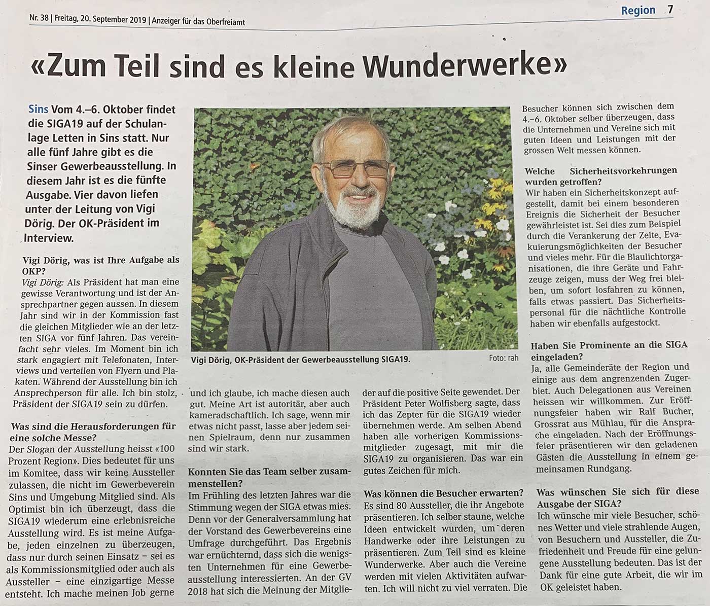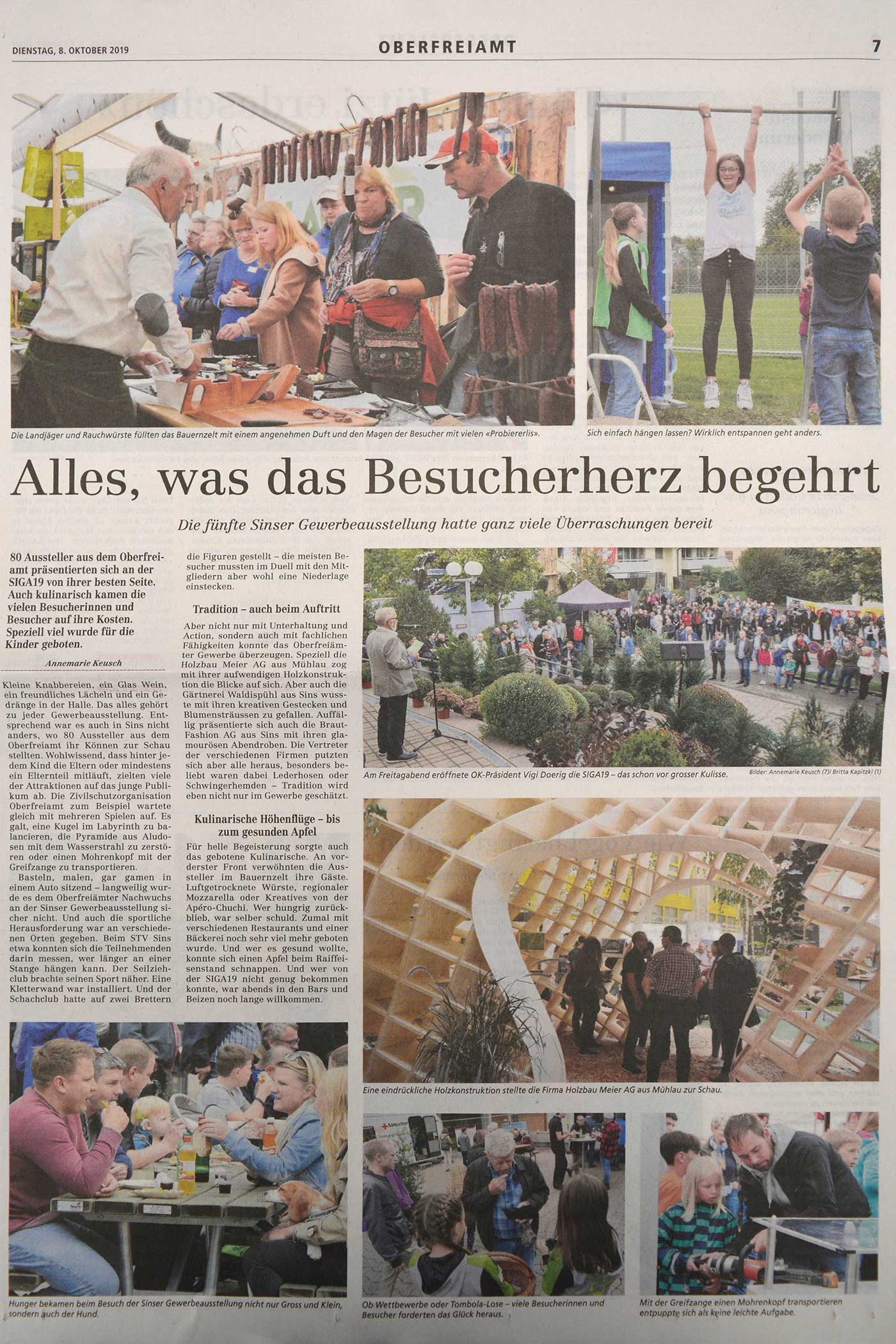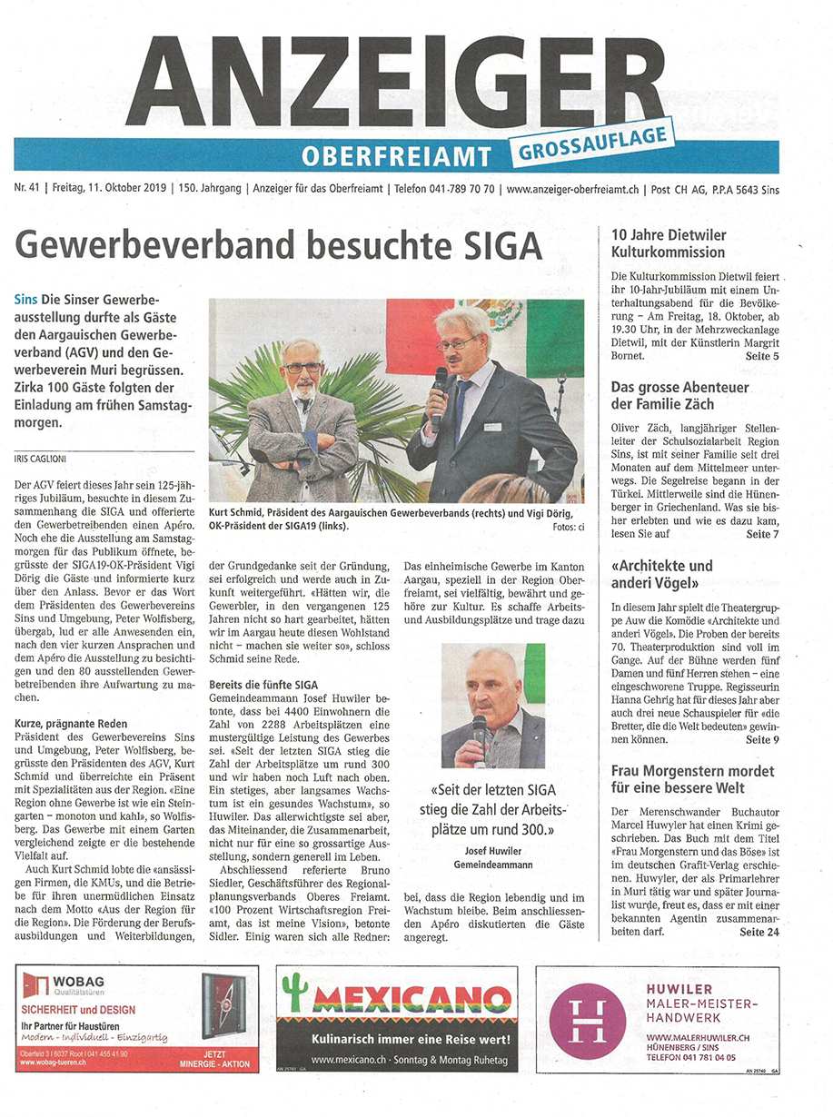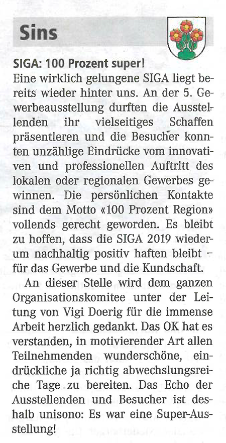 Die fünfte Sinser Gewerbeausstellung, die SIGA19, schloss nach drei erlebnisreichen Tagen die Toren mit einem Besucherrekord. 19'000 Besucher, 3000 mehr als vor fünf Jahren, besuchten die Leistungsschau des Oberfreiämter Gewerbes.